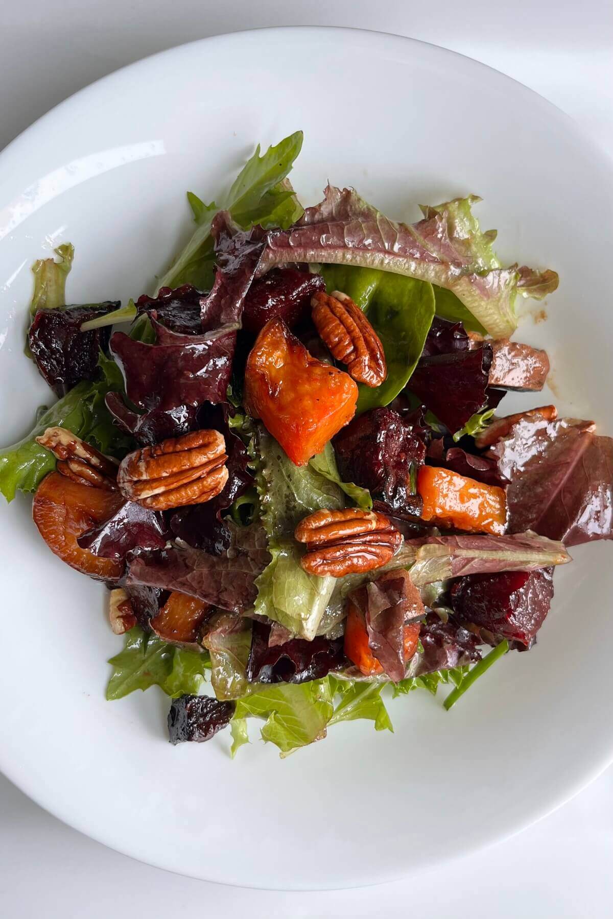 • Allow the sweet potatoes and beets to cool to room temperature, then add them to a large mixing bowl along with the salad greens, toasted pecans, and dressing.